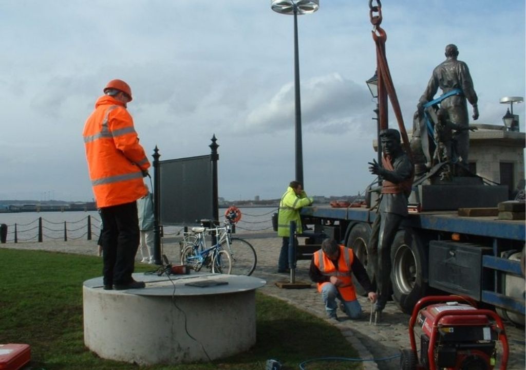 The Bronze Billy Fury statue moved from the courtyard of the Museum of Liverpool Life to it’s permanent position beside the Piermaster’s House.