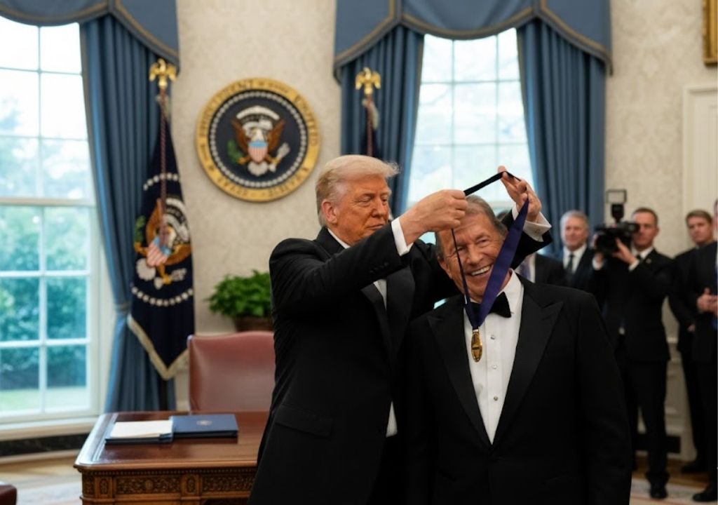 Trump began by welcoming country music legend George Strait, whose presence immediately drew applause. With a light moment of humor about Strait’s famously immaculate hair, Trump pinned the medal as the room erupted in cheers. The tone shifted gently as Broadway titan Michael Crawford, known globally for The Phantom of the Opera, stepped forward. Trump praised Crawford’s extraordinary stage legacy before presenting his medallion.